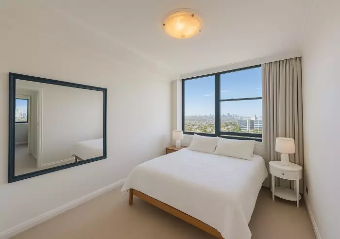 • Second spacious bedroom with unobstructed skyline views and large mirrored wall