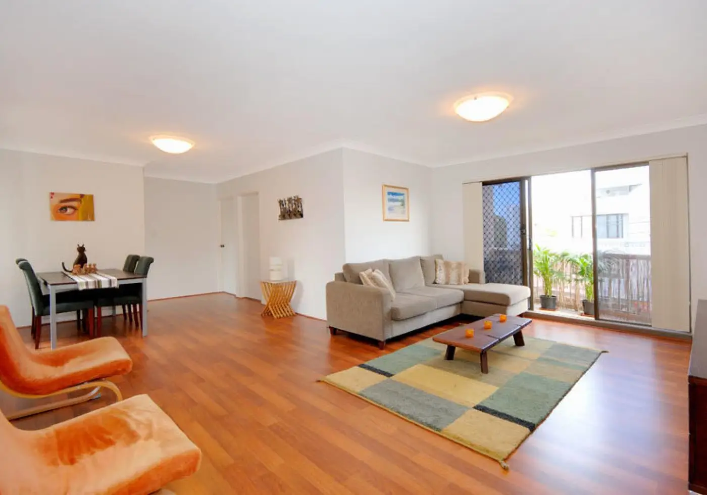 - Open plan living and dining area brims with striking timber floors