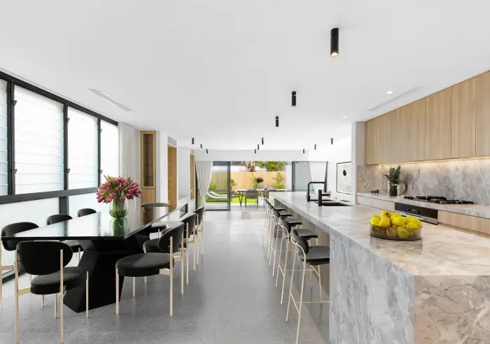 - Luxuriously appointed chef’s kitchen that’s as stylish as it is functional, featuring Italian marble benchtops, Miele gas cooking, walk-in pantry, double sink with zip tap, and built-in fridge & dishwasher