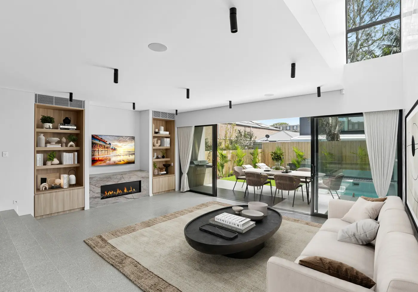 - A light-filled, open-plan dining space (complete with home bar) steps down to a sunken living room with gas fireplace and Sonos inbuilt ceiling speakers and soundbar